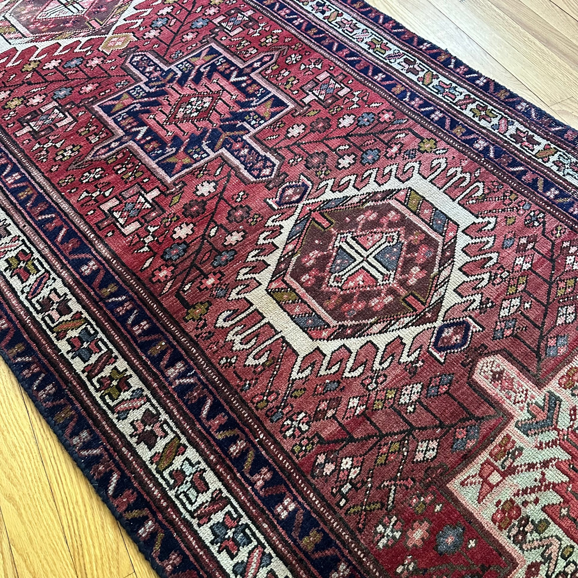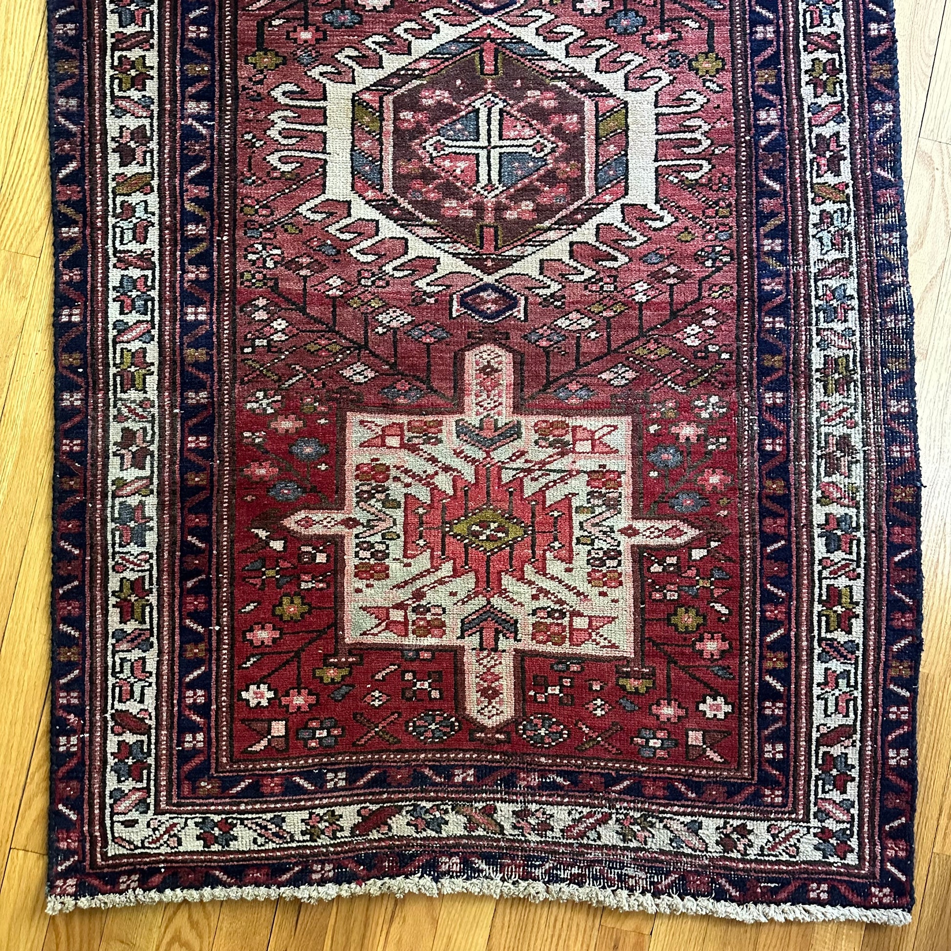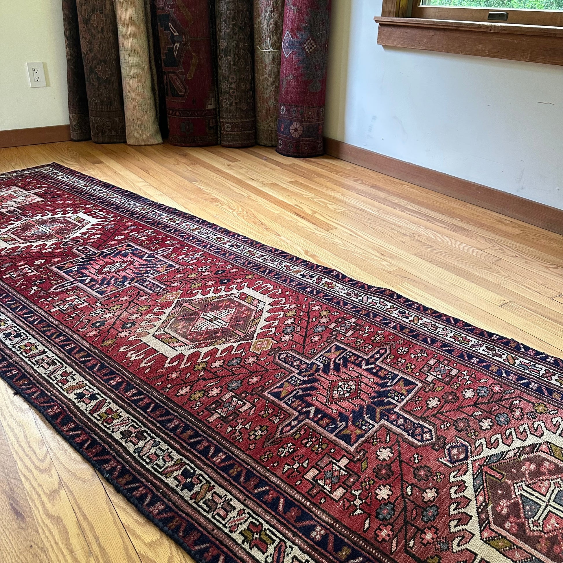 Gorgeous Karjara runner in soft red. Stacked borders and repeating medallions, beautiful floral vines. Handwoven vintage wool, low pile, medium weight.