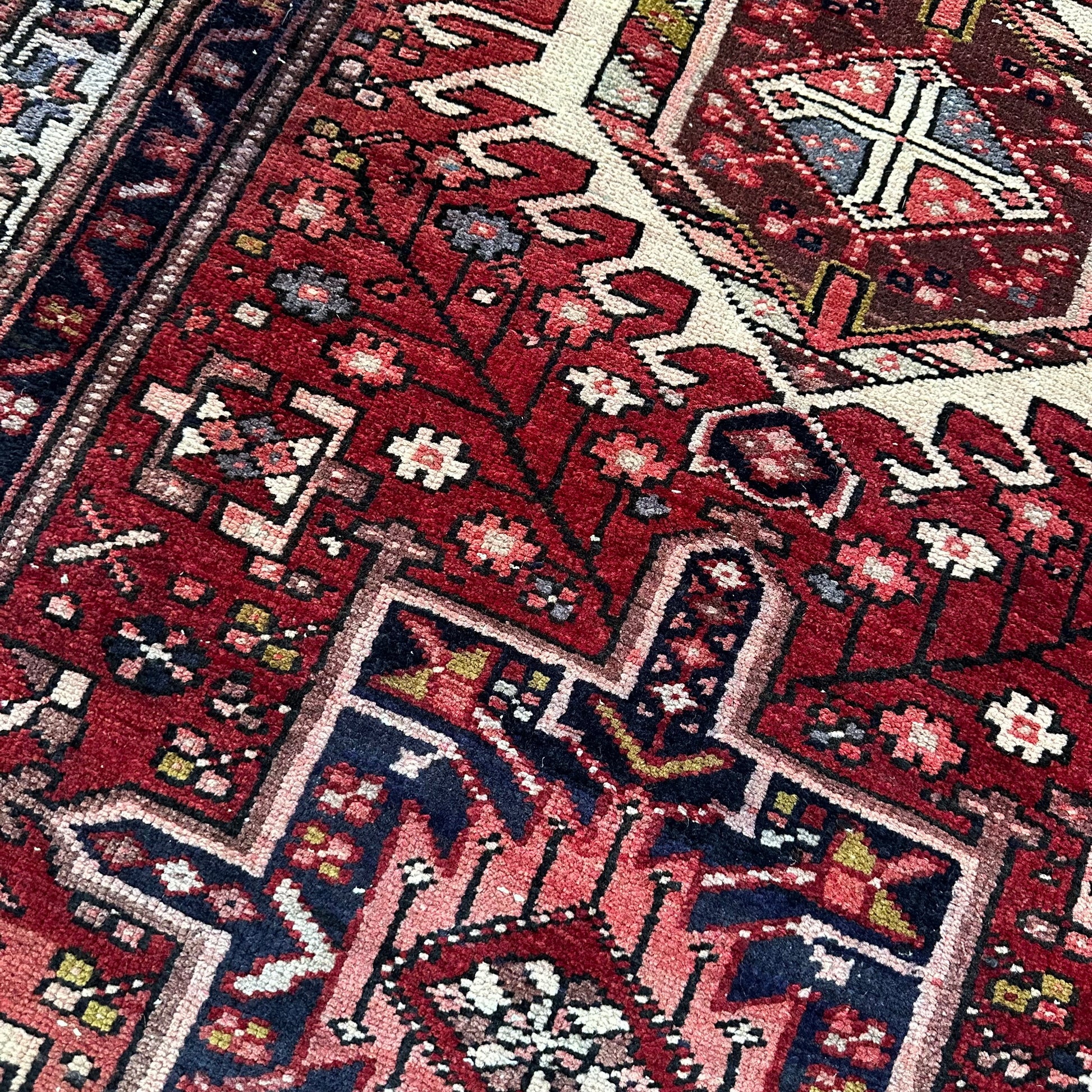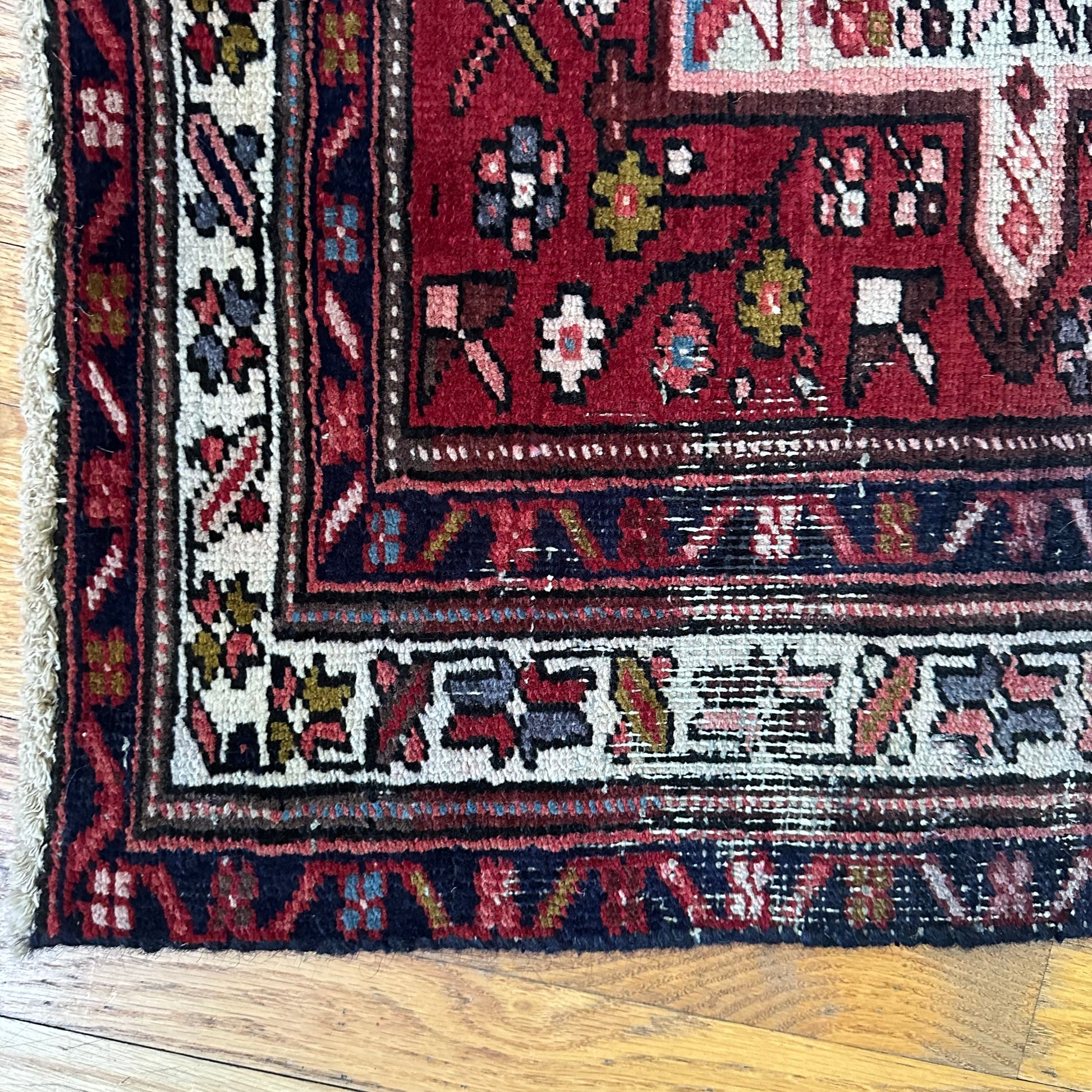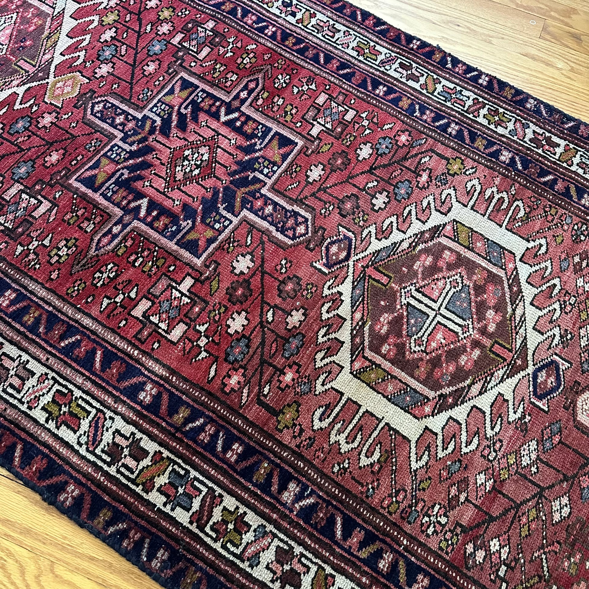 Gorgeous Karjara runner in soft red. Stacked borders and repeating medallions, beautiful floral vines. Handwoven vintage wool, low pile, medium weight.