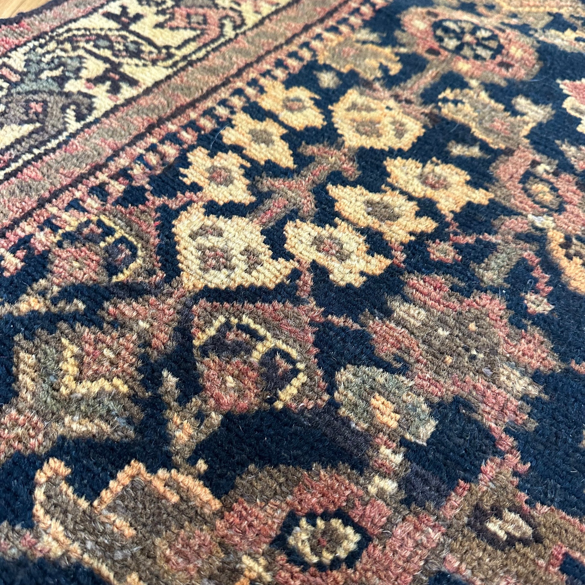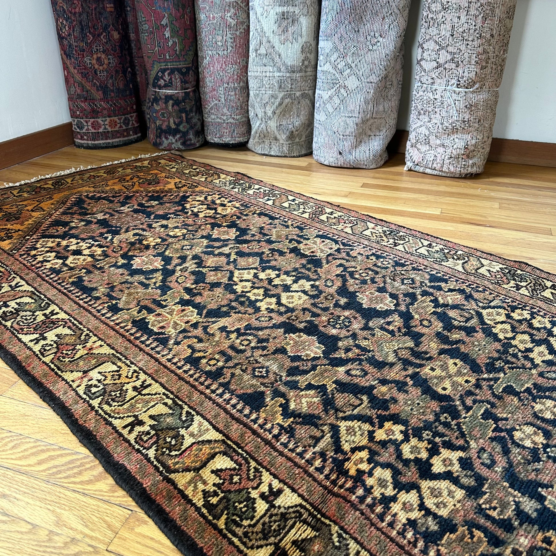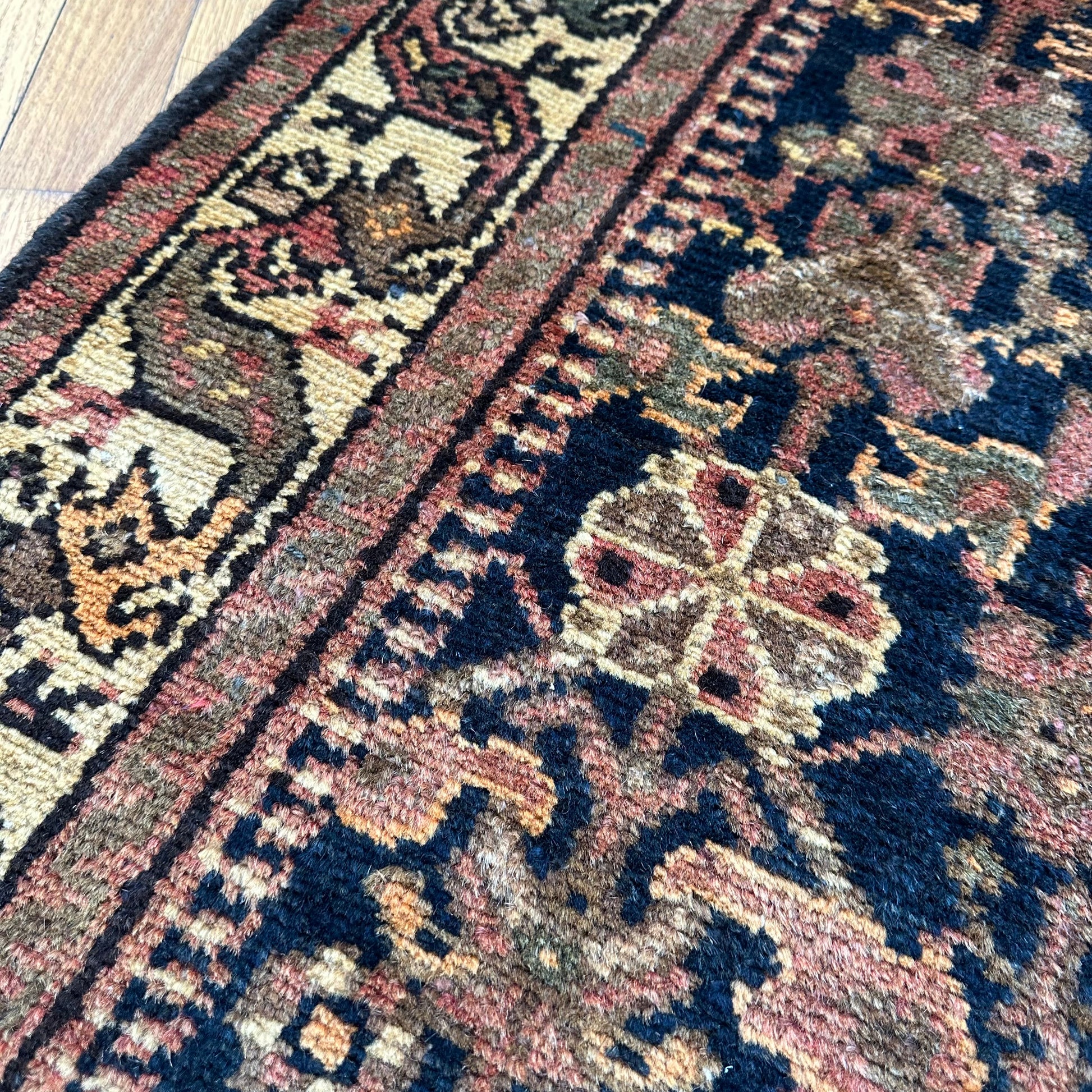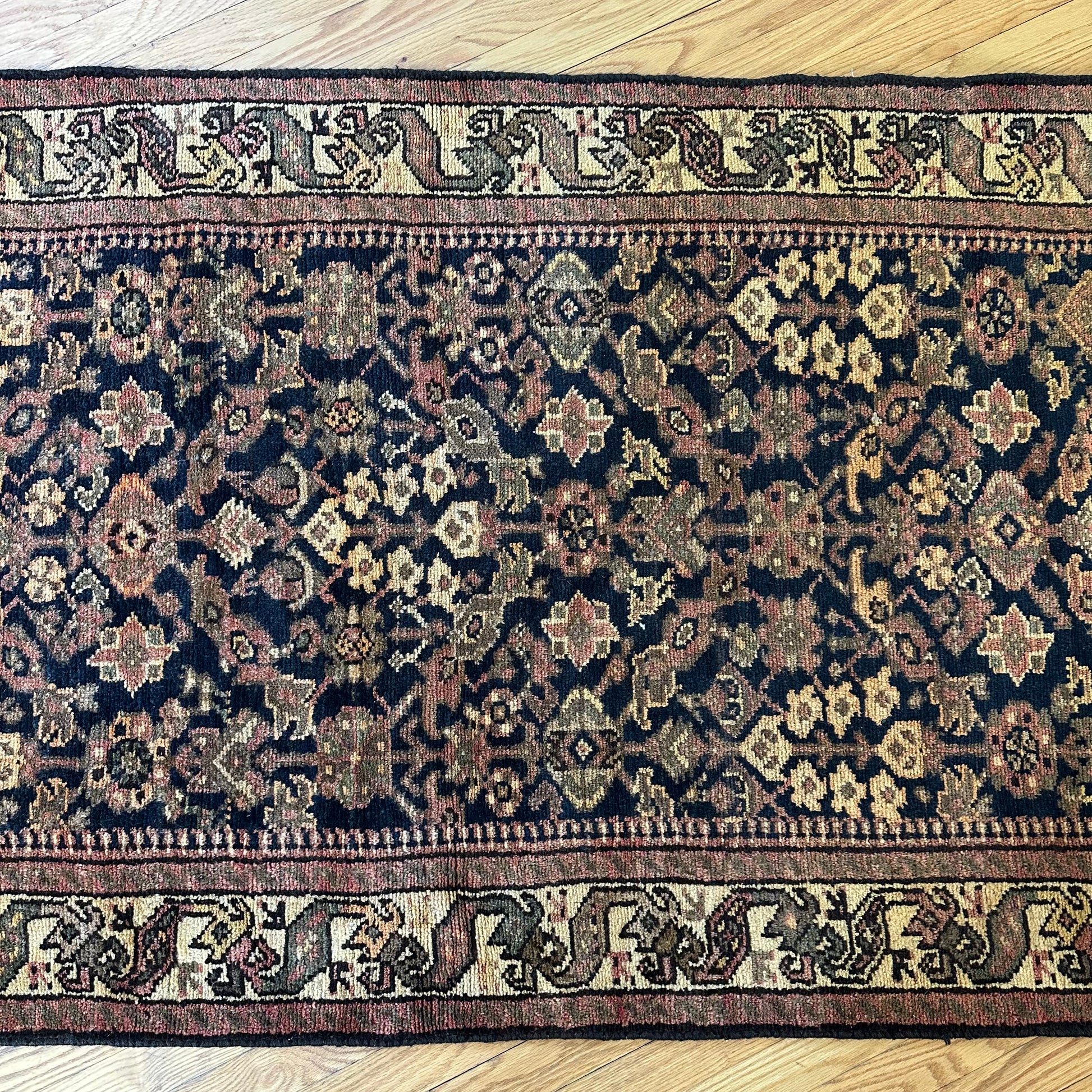 A long Persian runner in navy with terracotta, cream, and soft orange. Handwoven vintage wool, low pile, medium weight.
