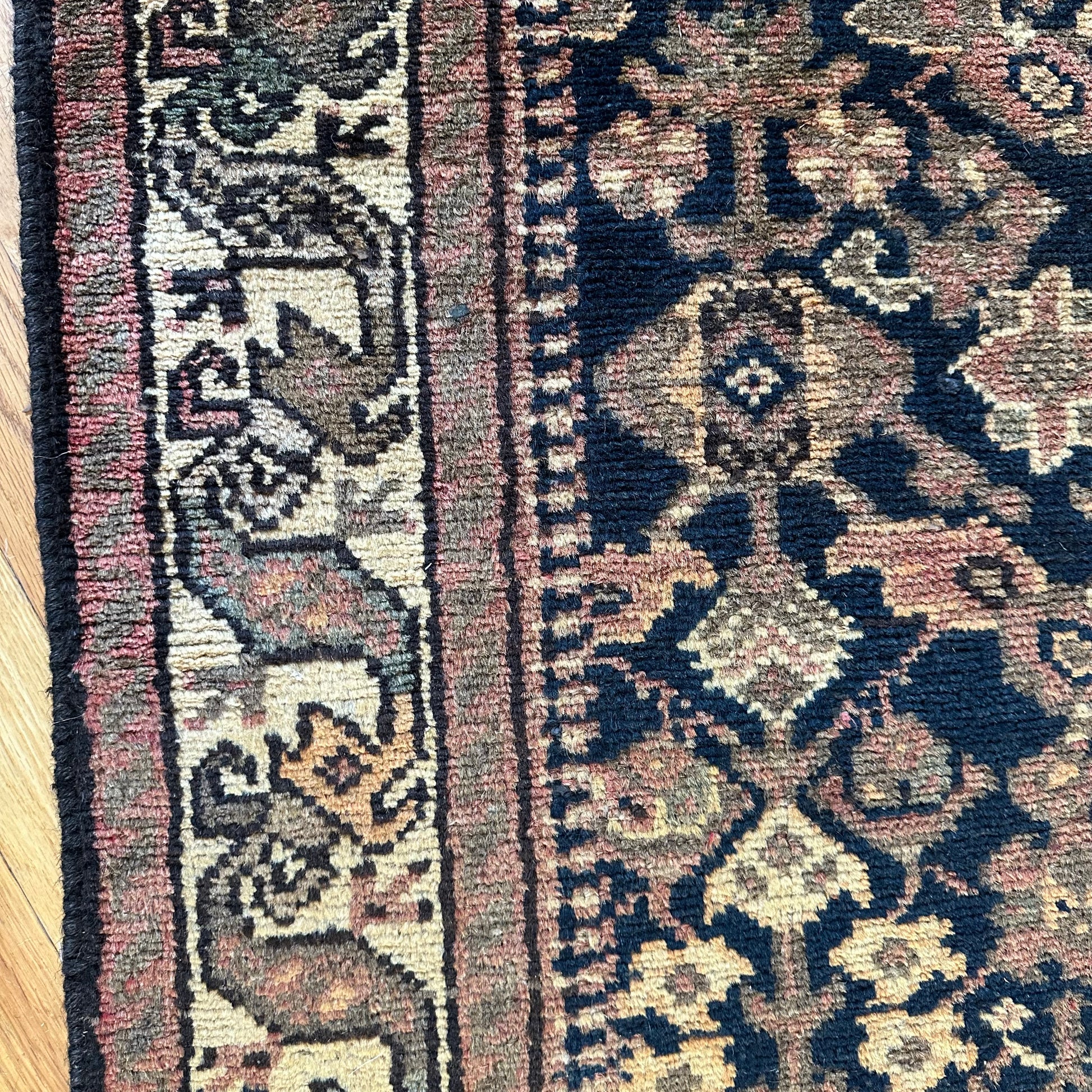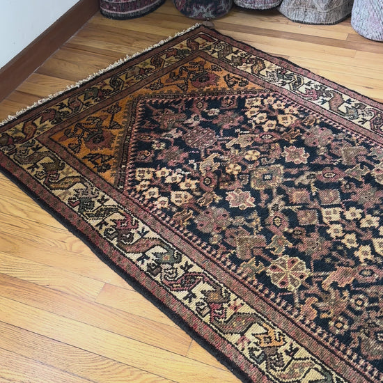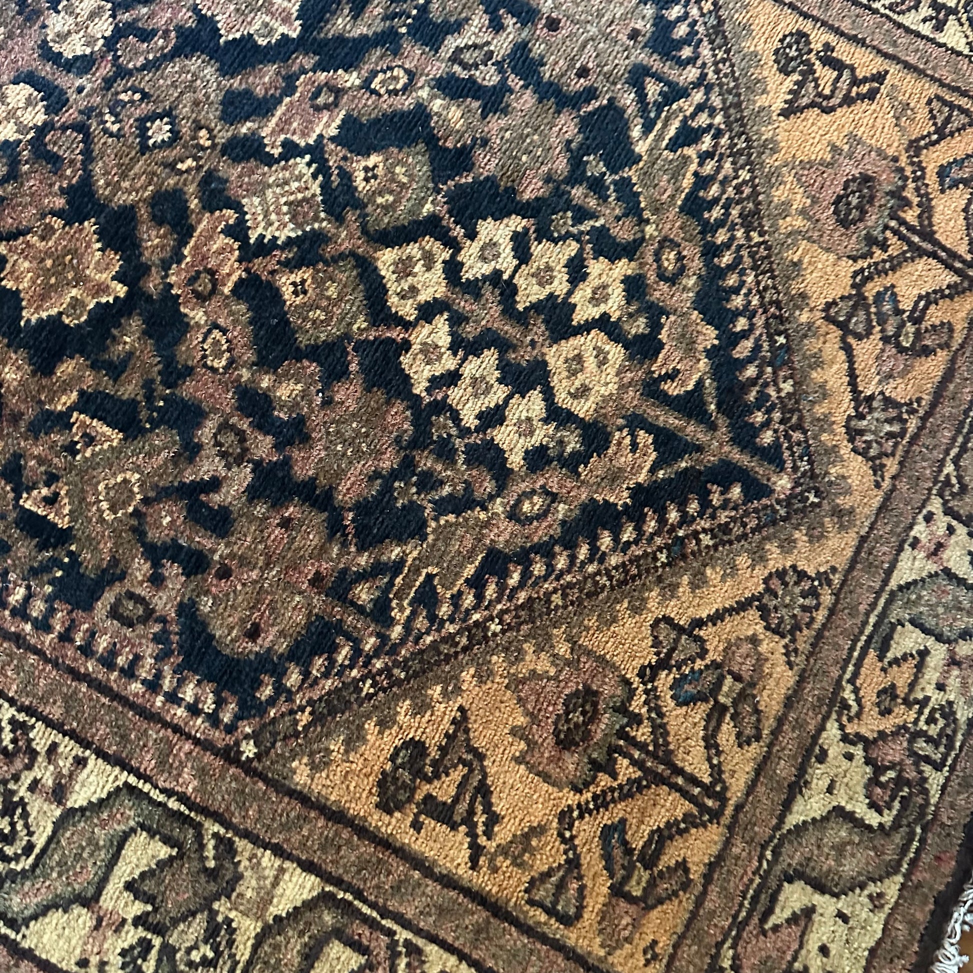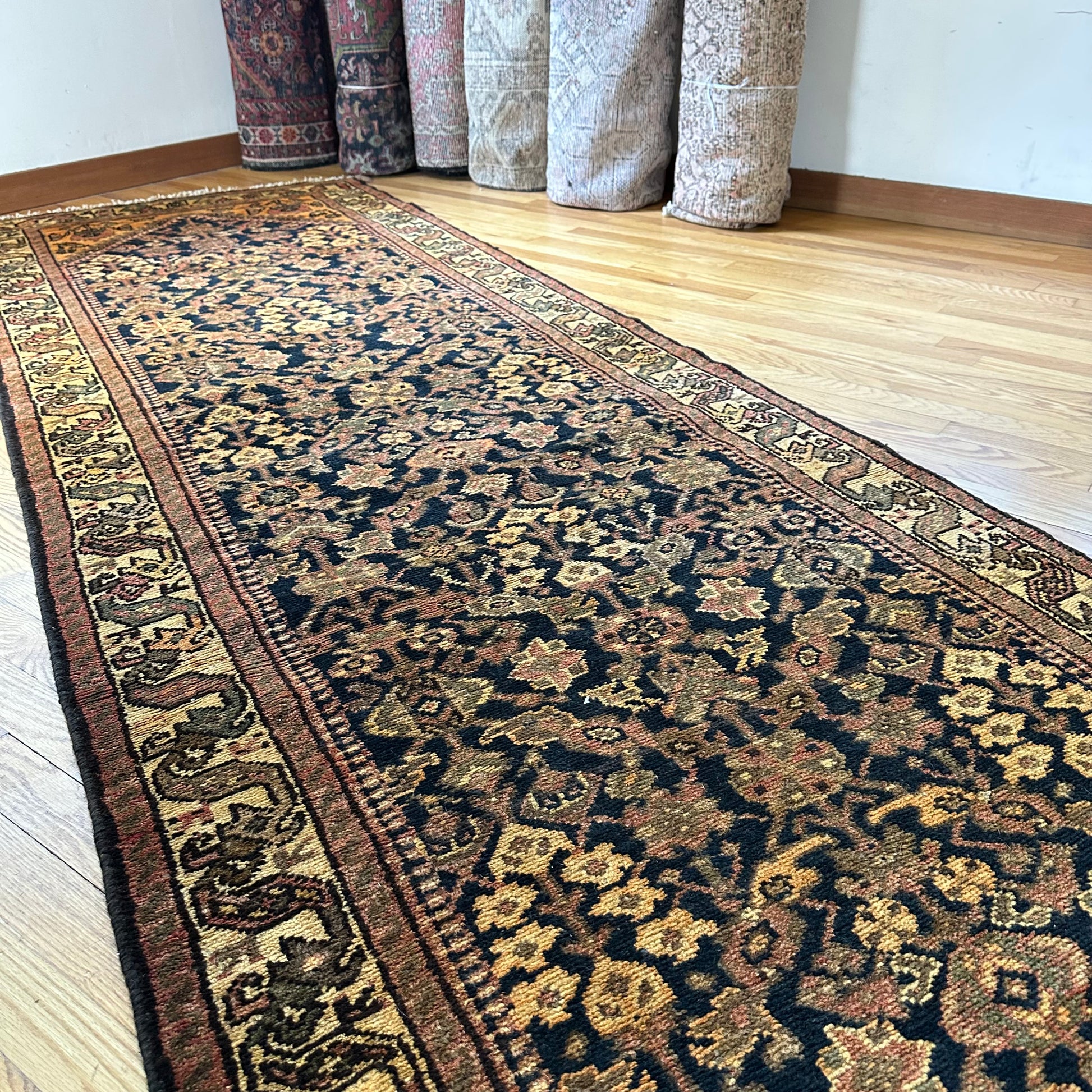 A long Persian runner in navy with terracotta, cream, and soft orange. Handwoven vintage wool, low pile, medium weight.