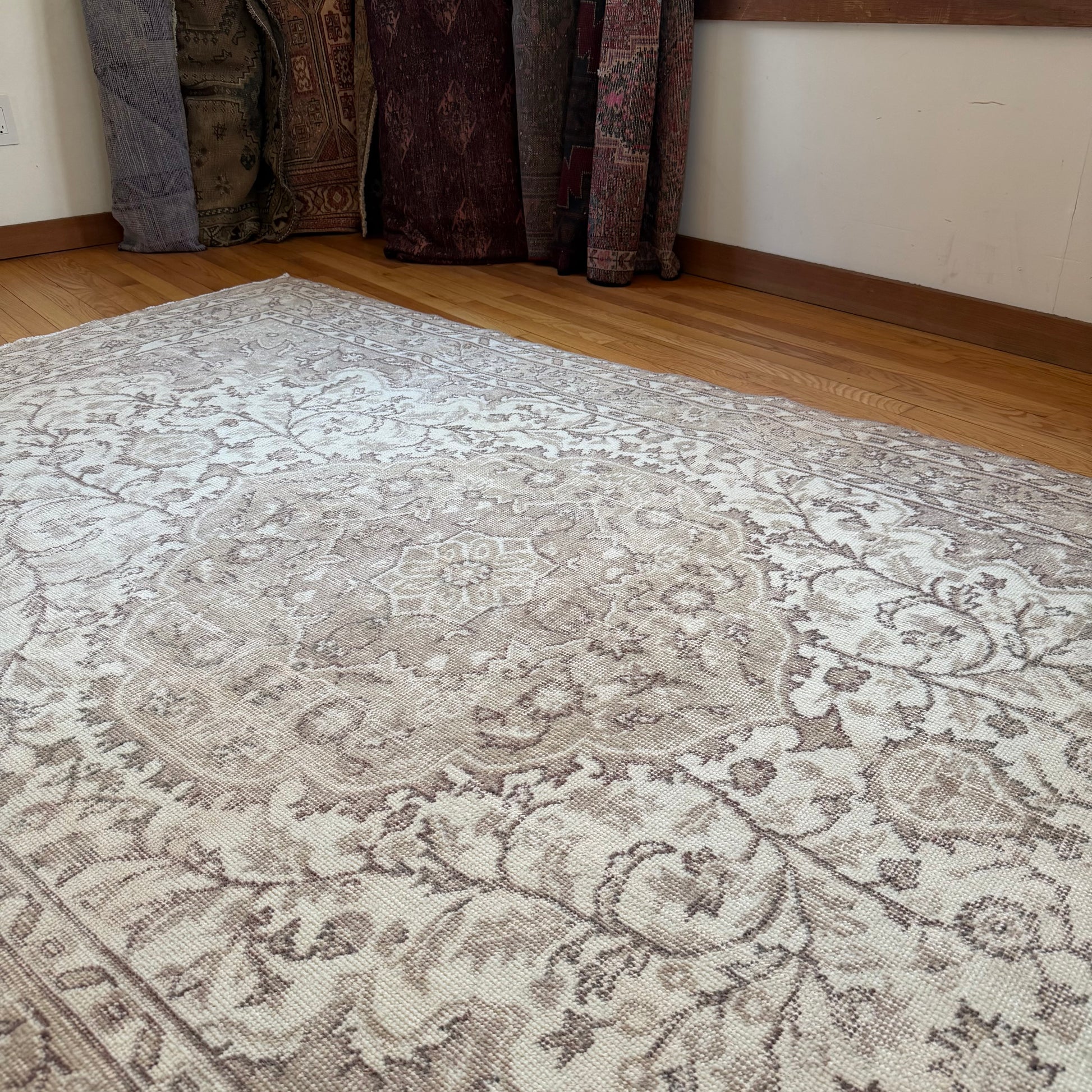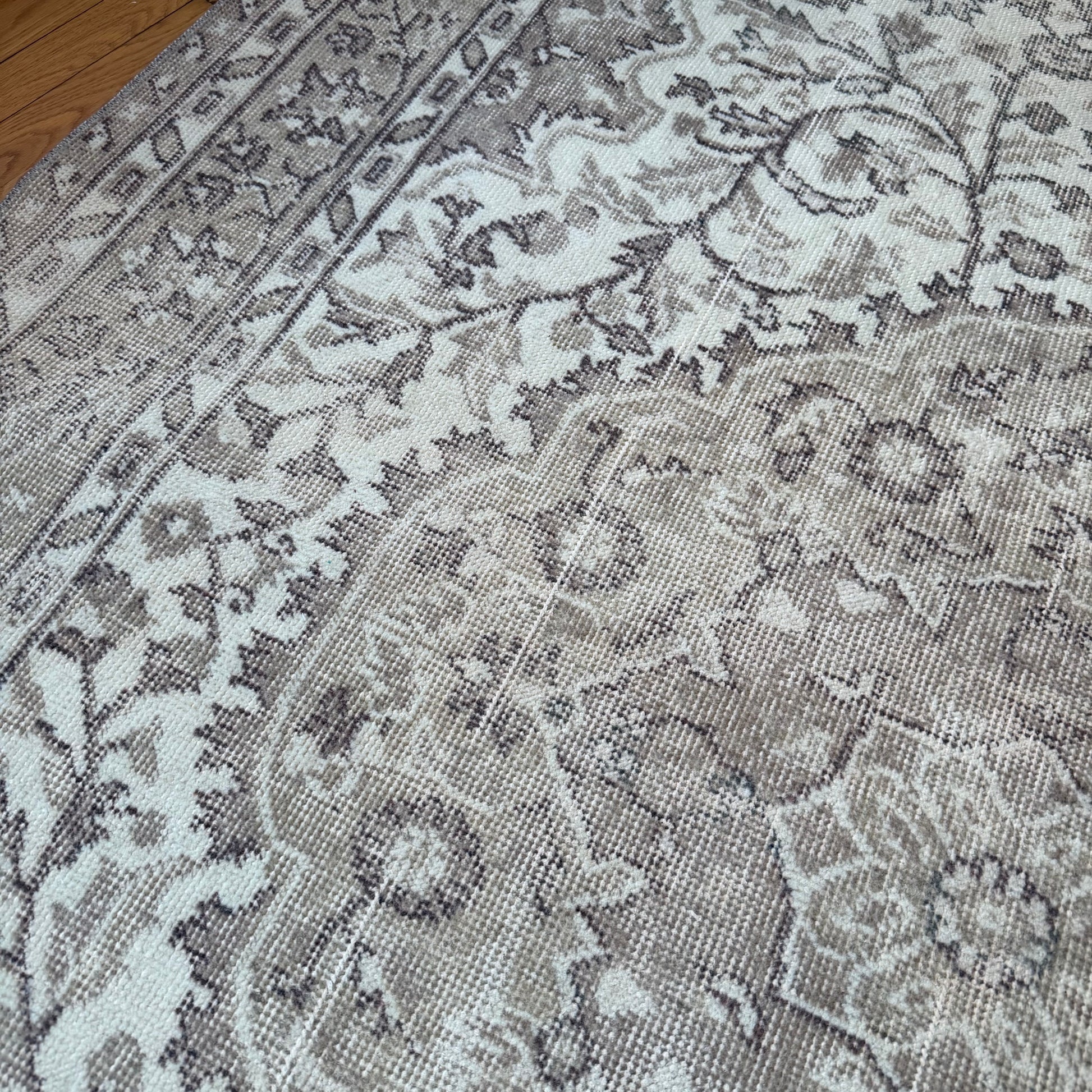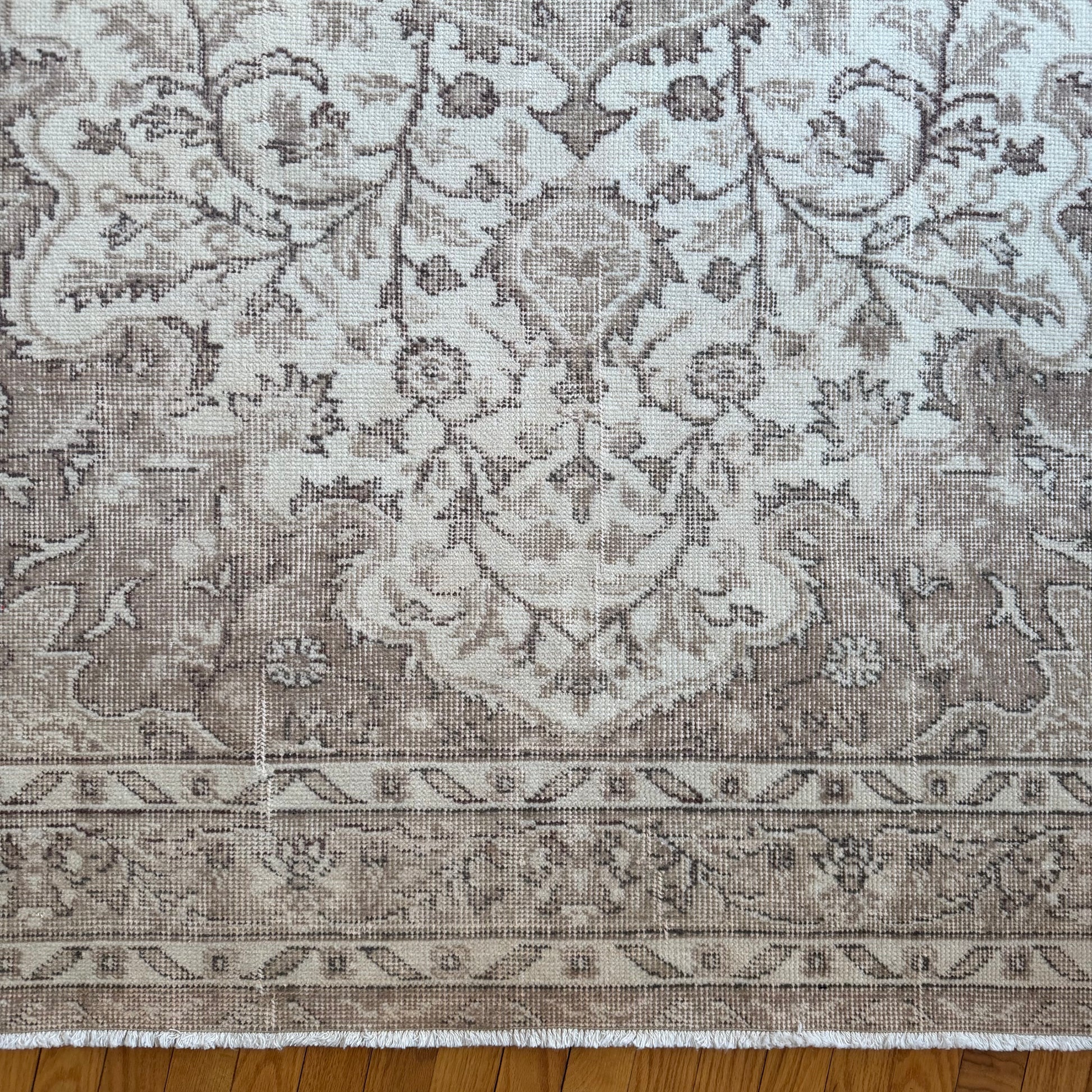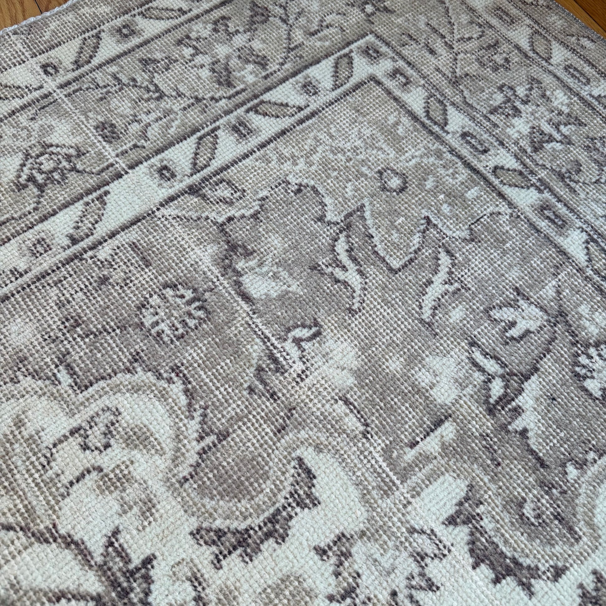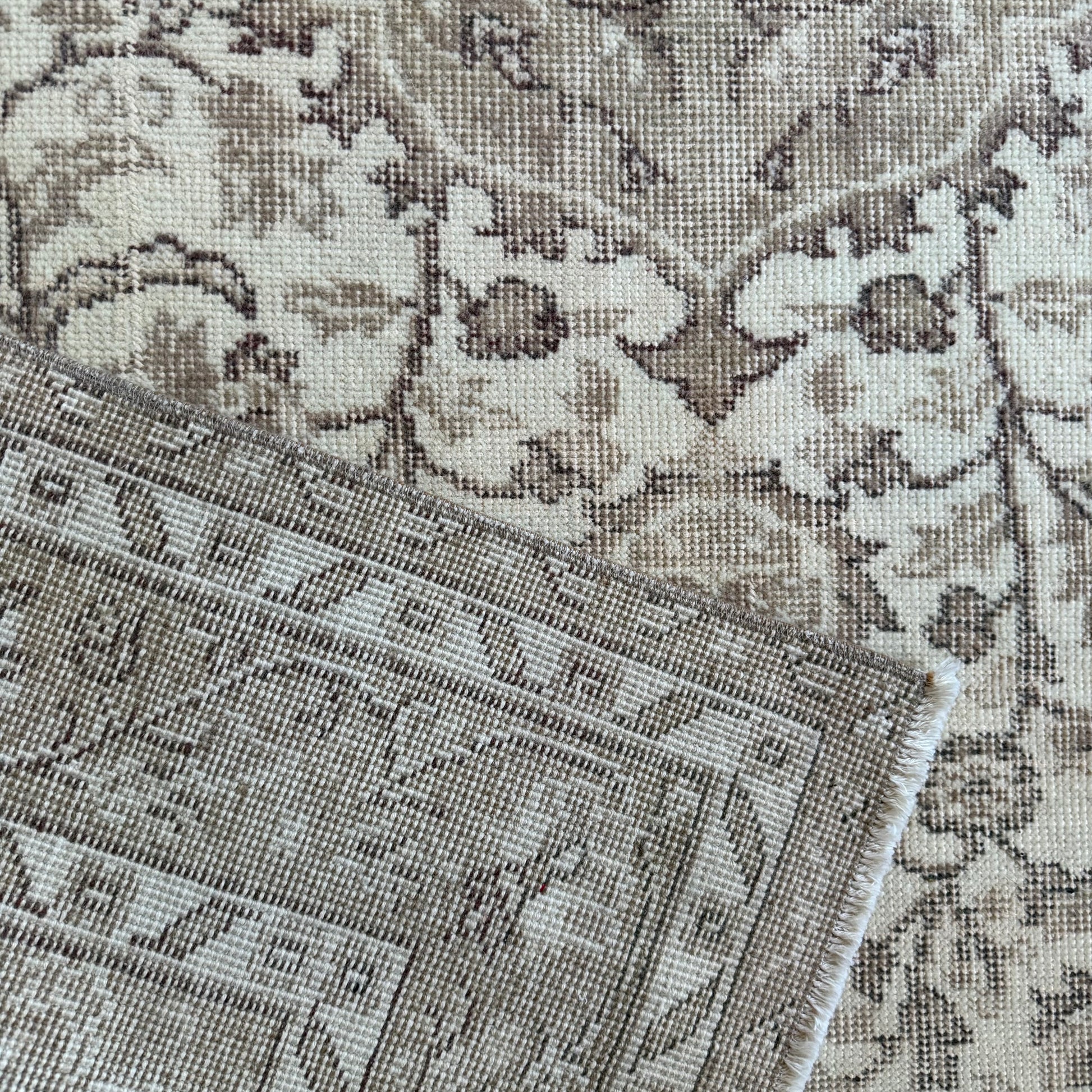 Turkish rug with large-scale florals in neutrals: gray, beige, and white. Handwoven vintage wool, pile, weight.