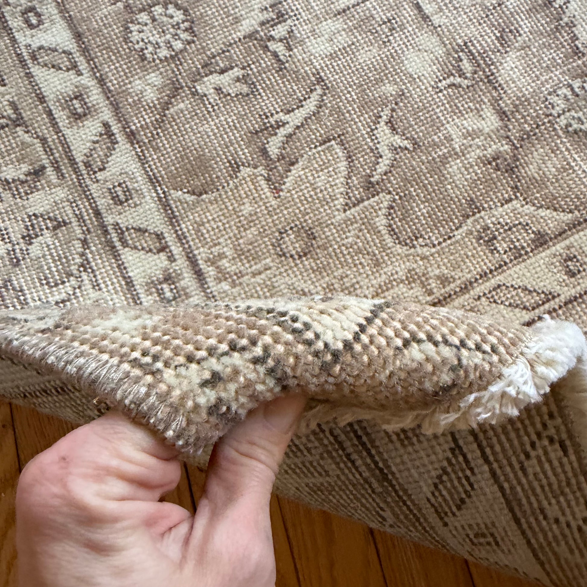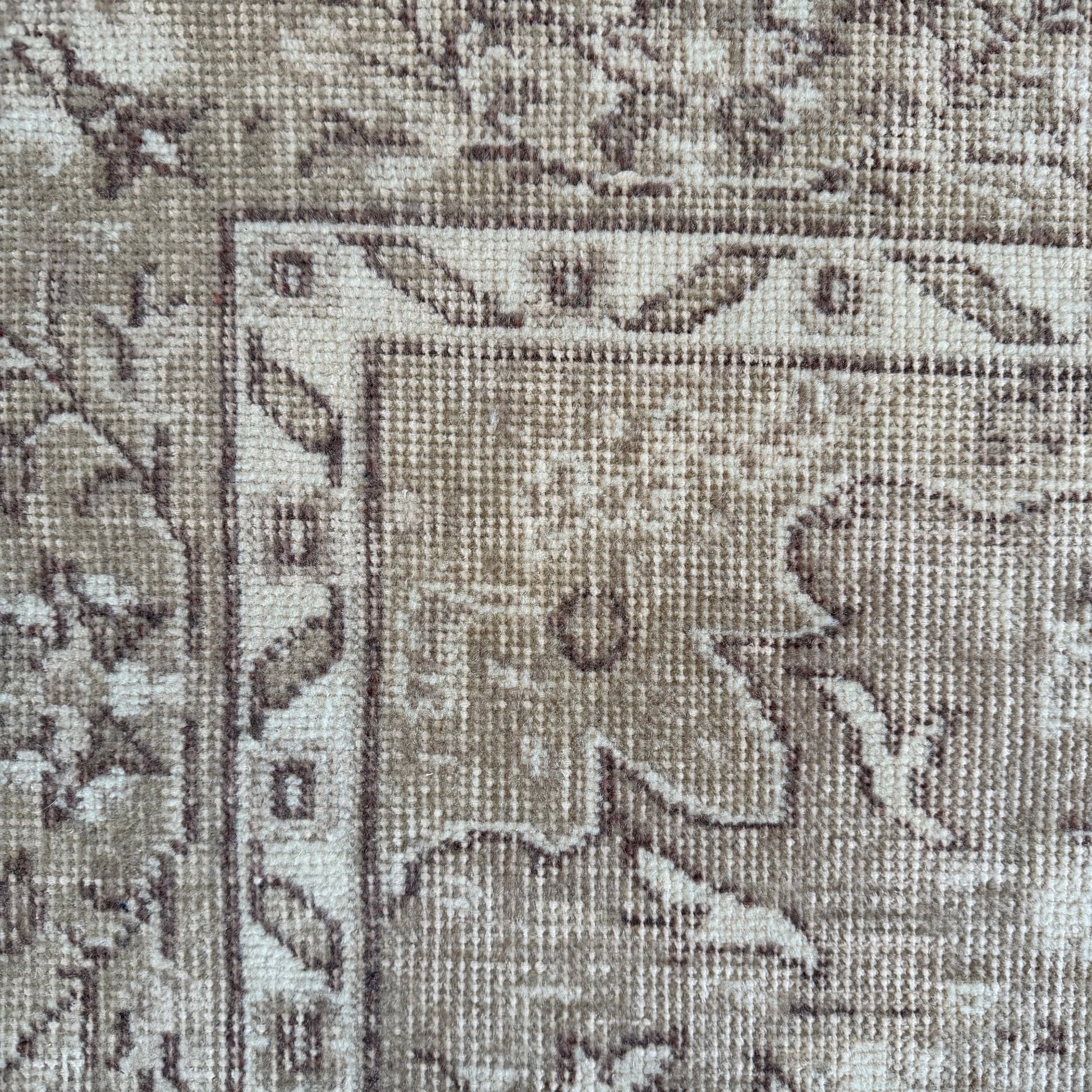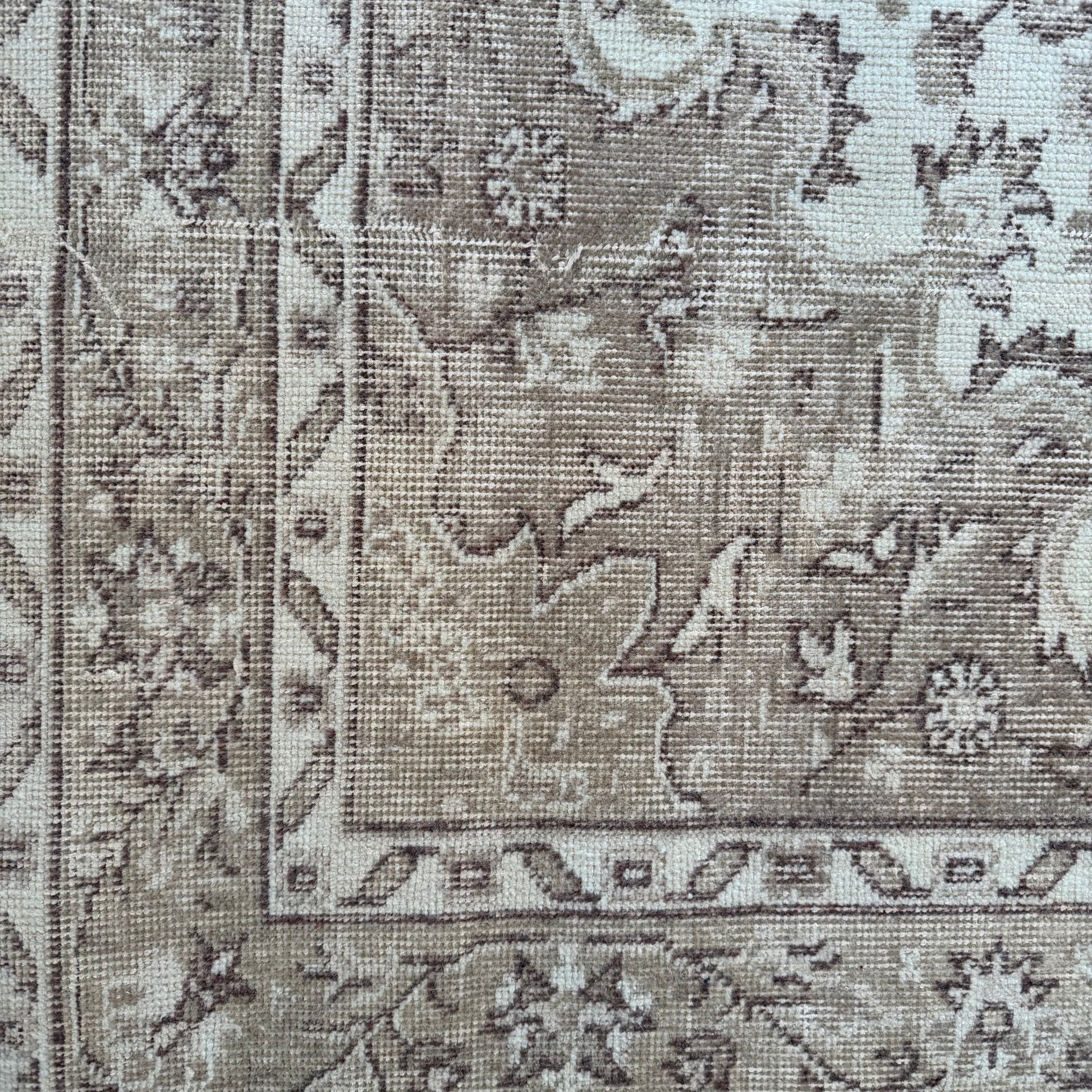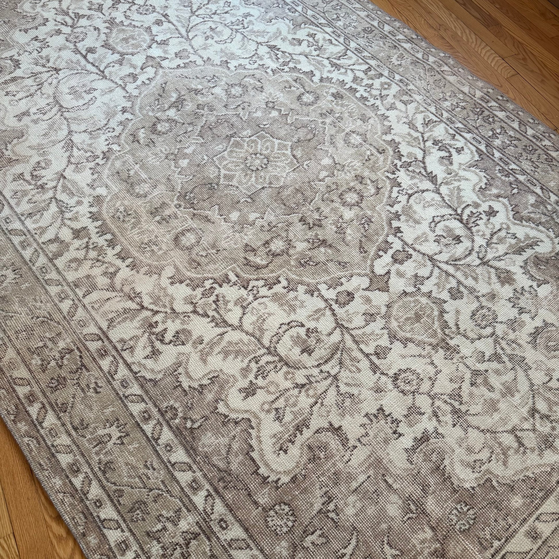 Turkish rug with large-scale florals in neutrals: gray, beige, and white. Handwoven vintage wool, pile, weight.