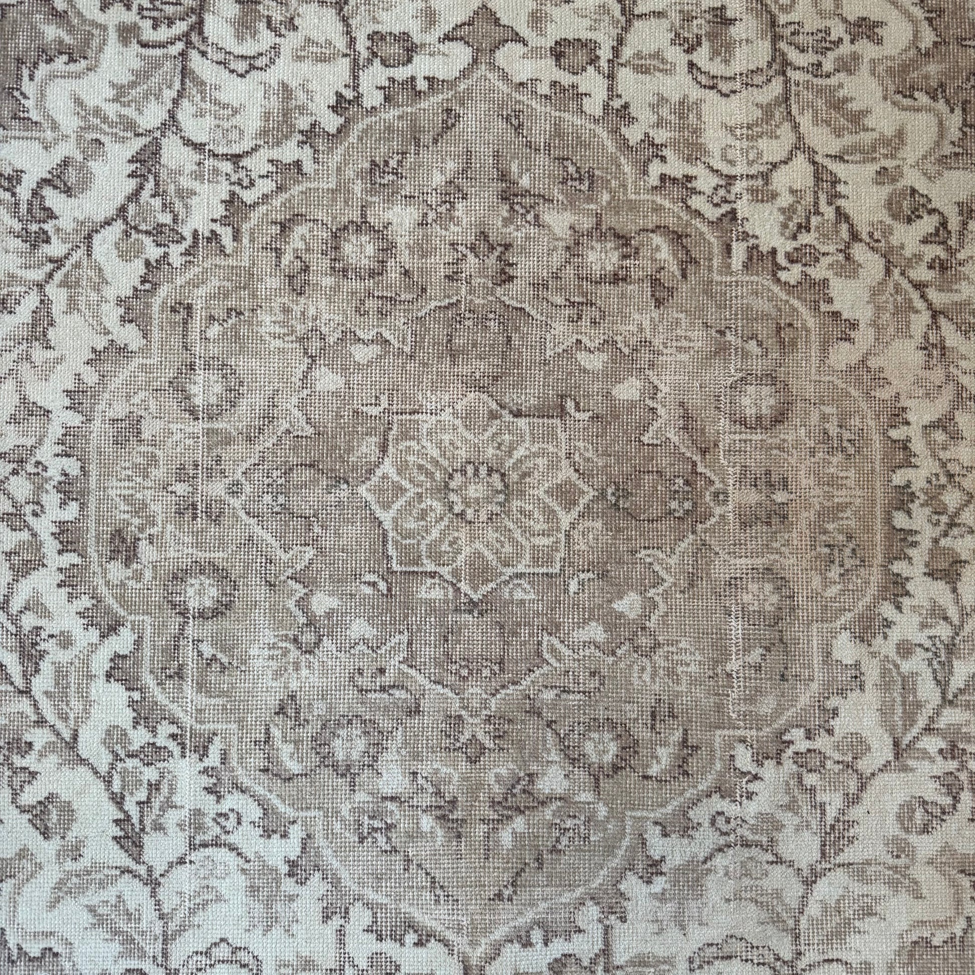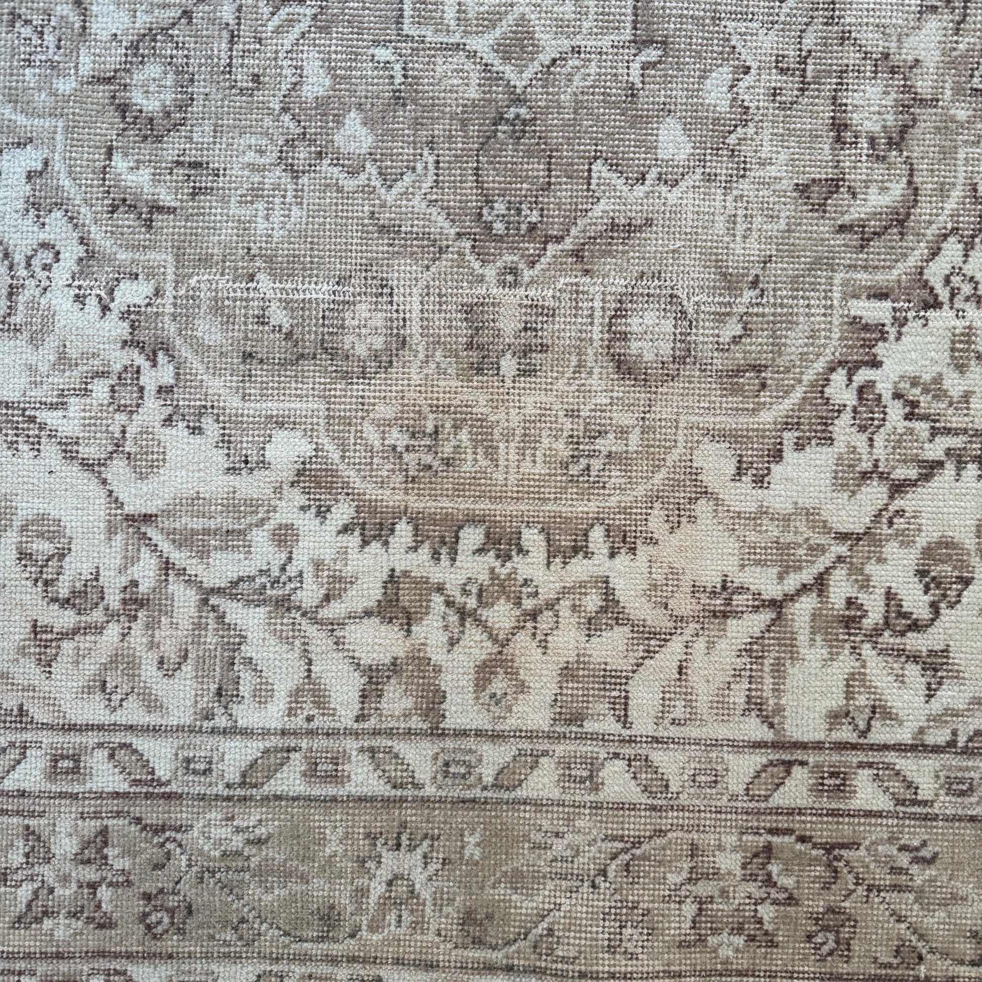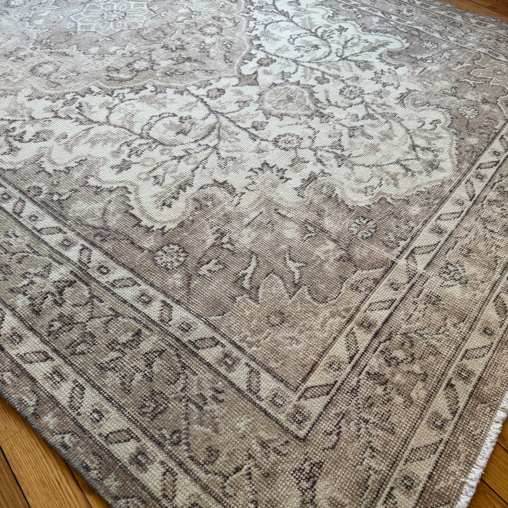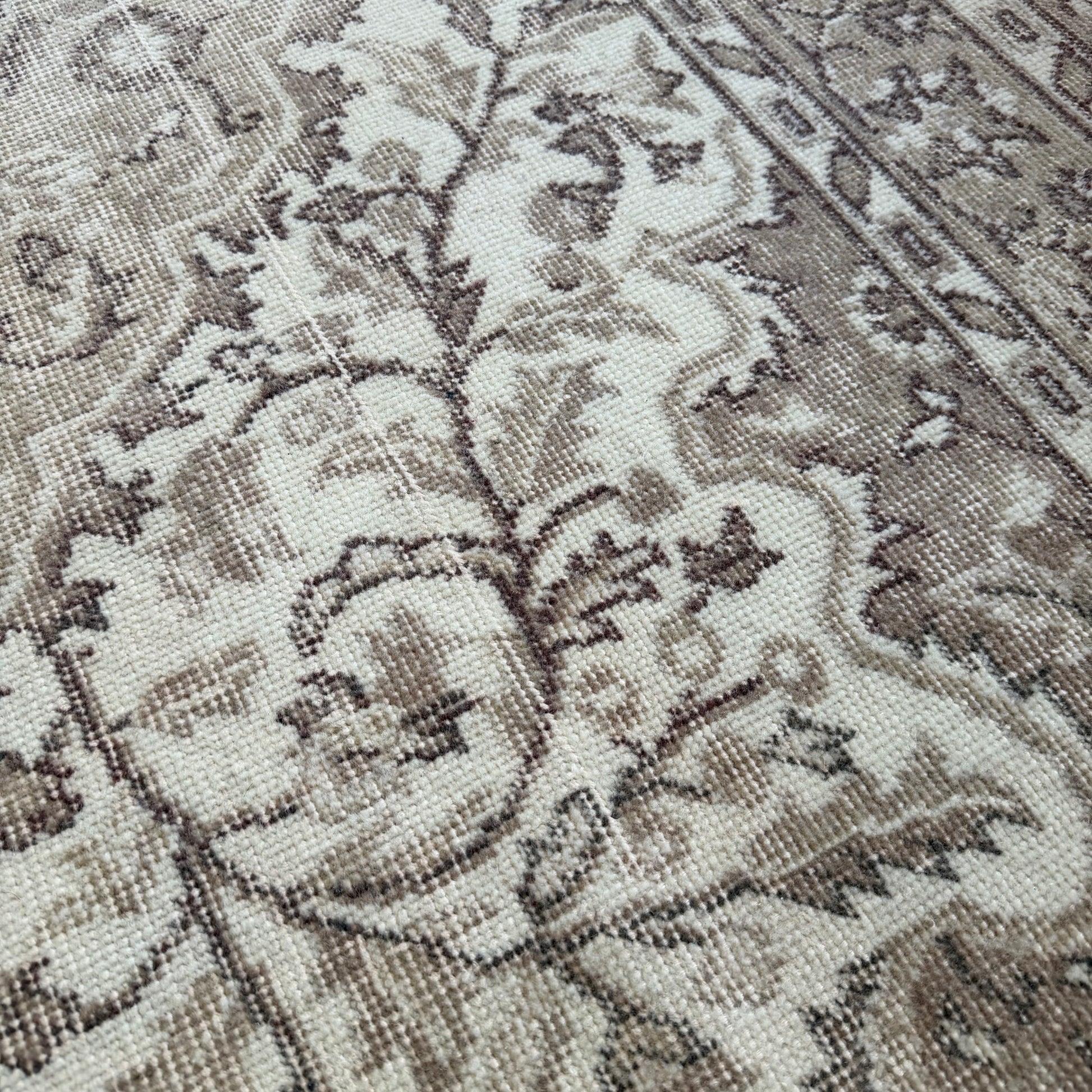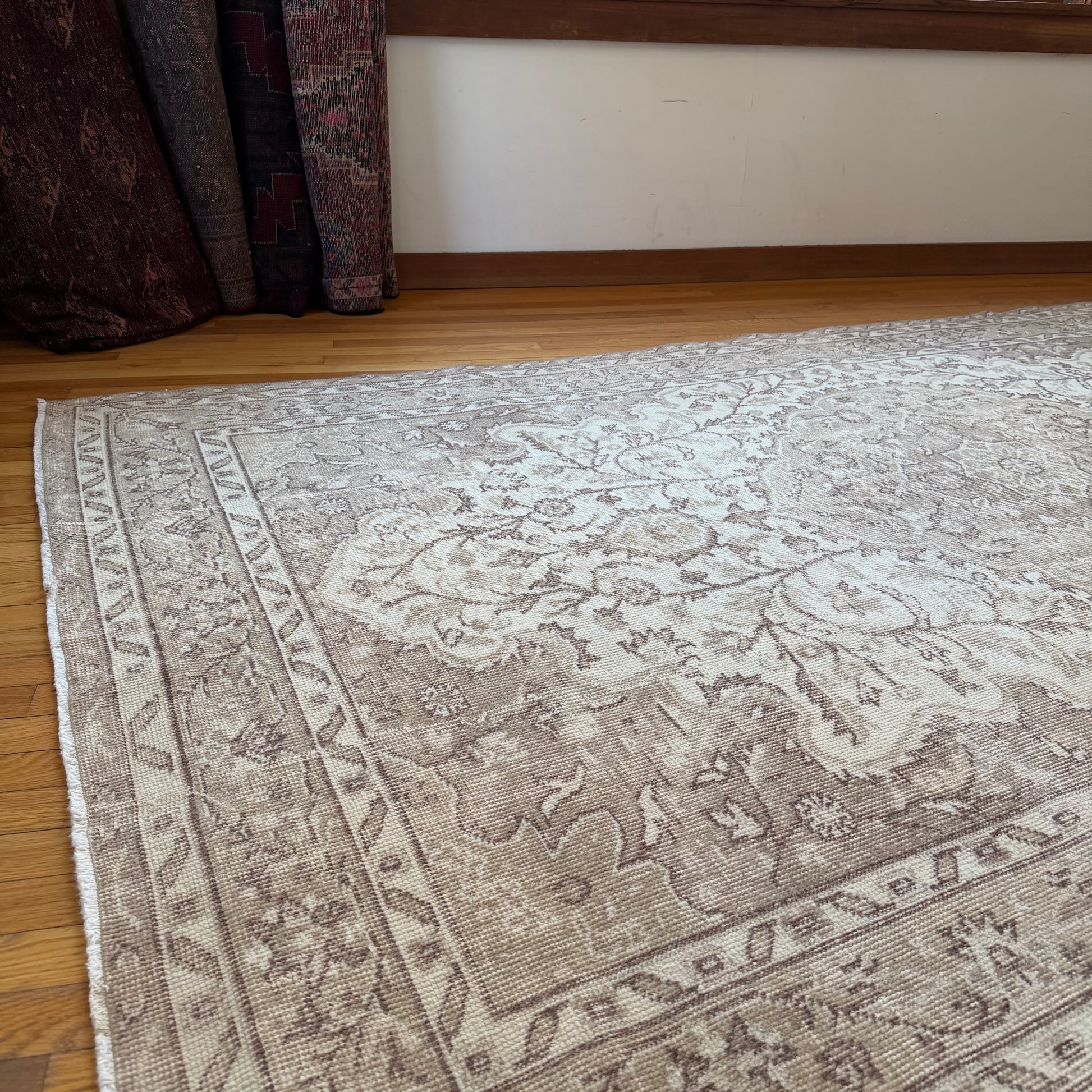 Turkish rug with large-scale florals in neutrals: gray, beige, and white. Handwoven vintage wool, pile, weight.