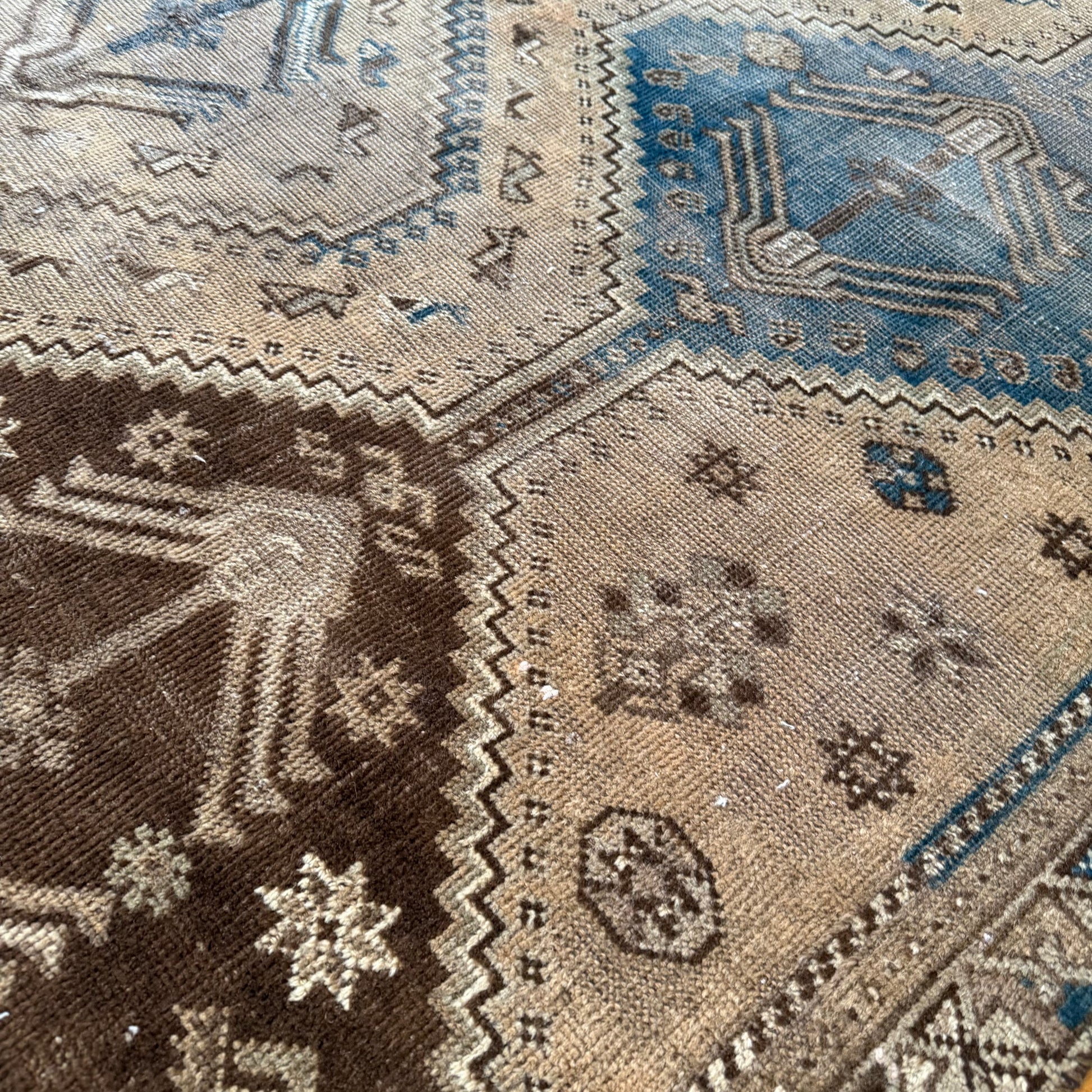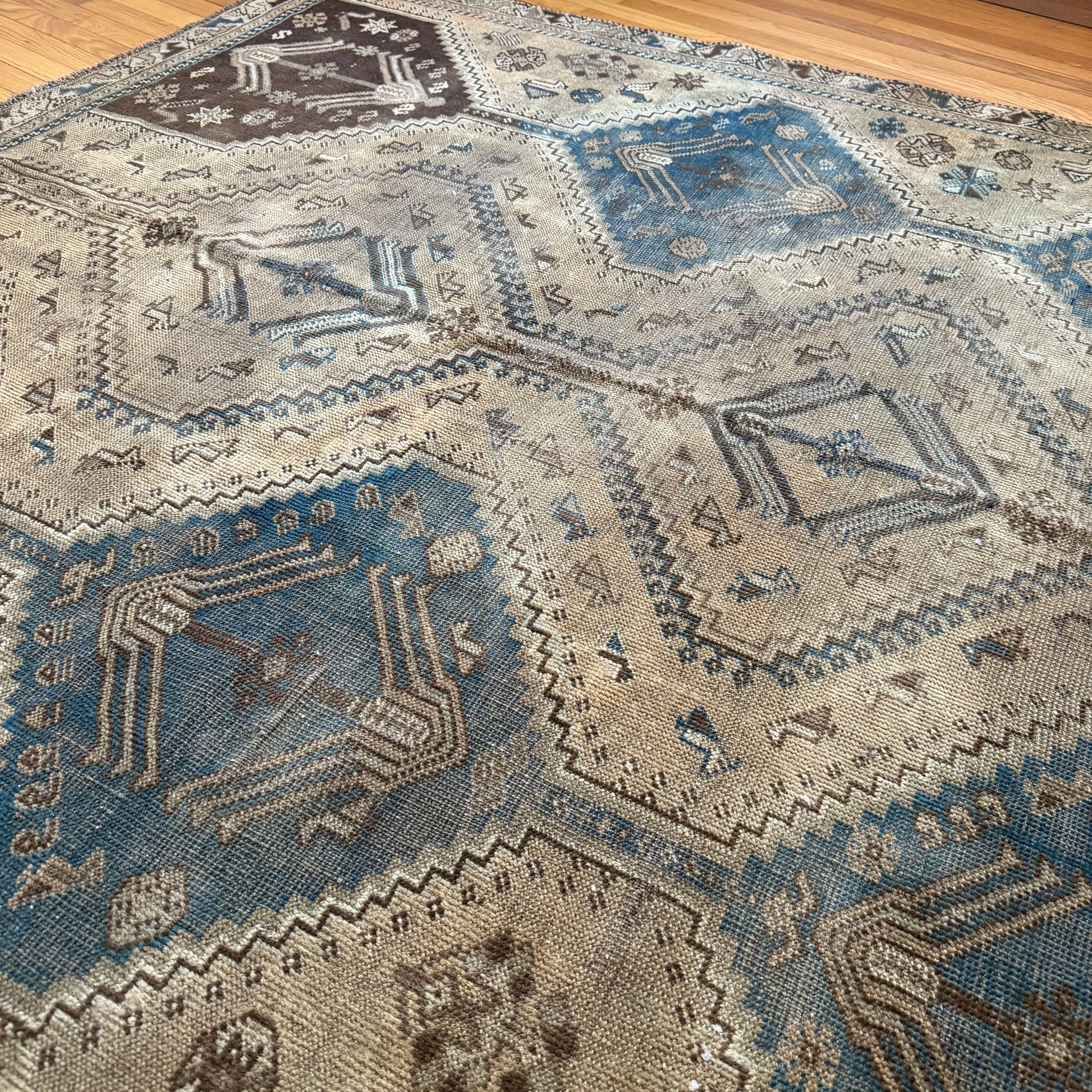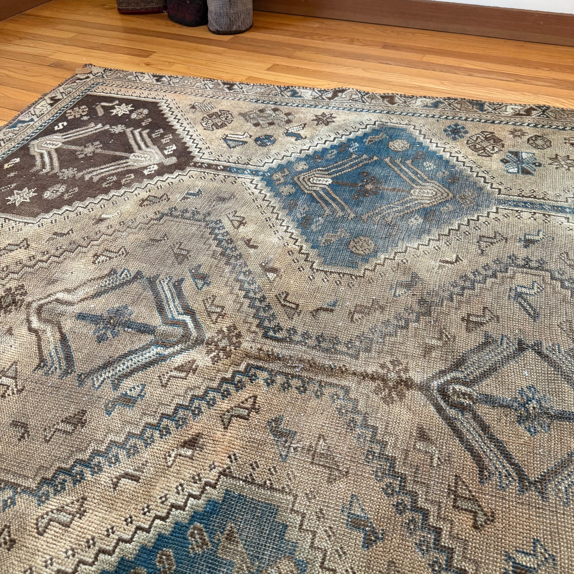 Gorgeous blues and browns on warm tan field. Turkish Oushak with beautiful star and animals motifs. Low pile, medium-light weight, handwoven vintage wool.