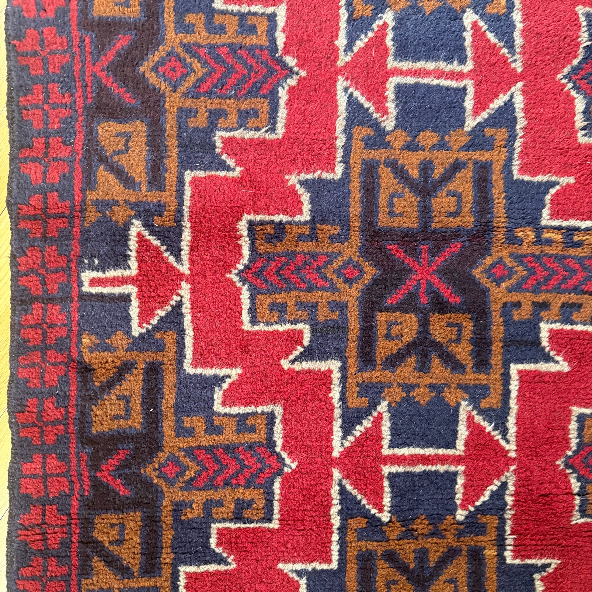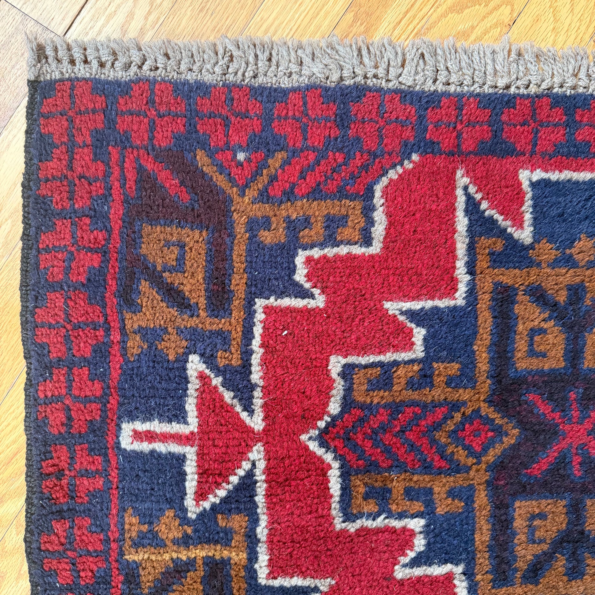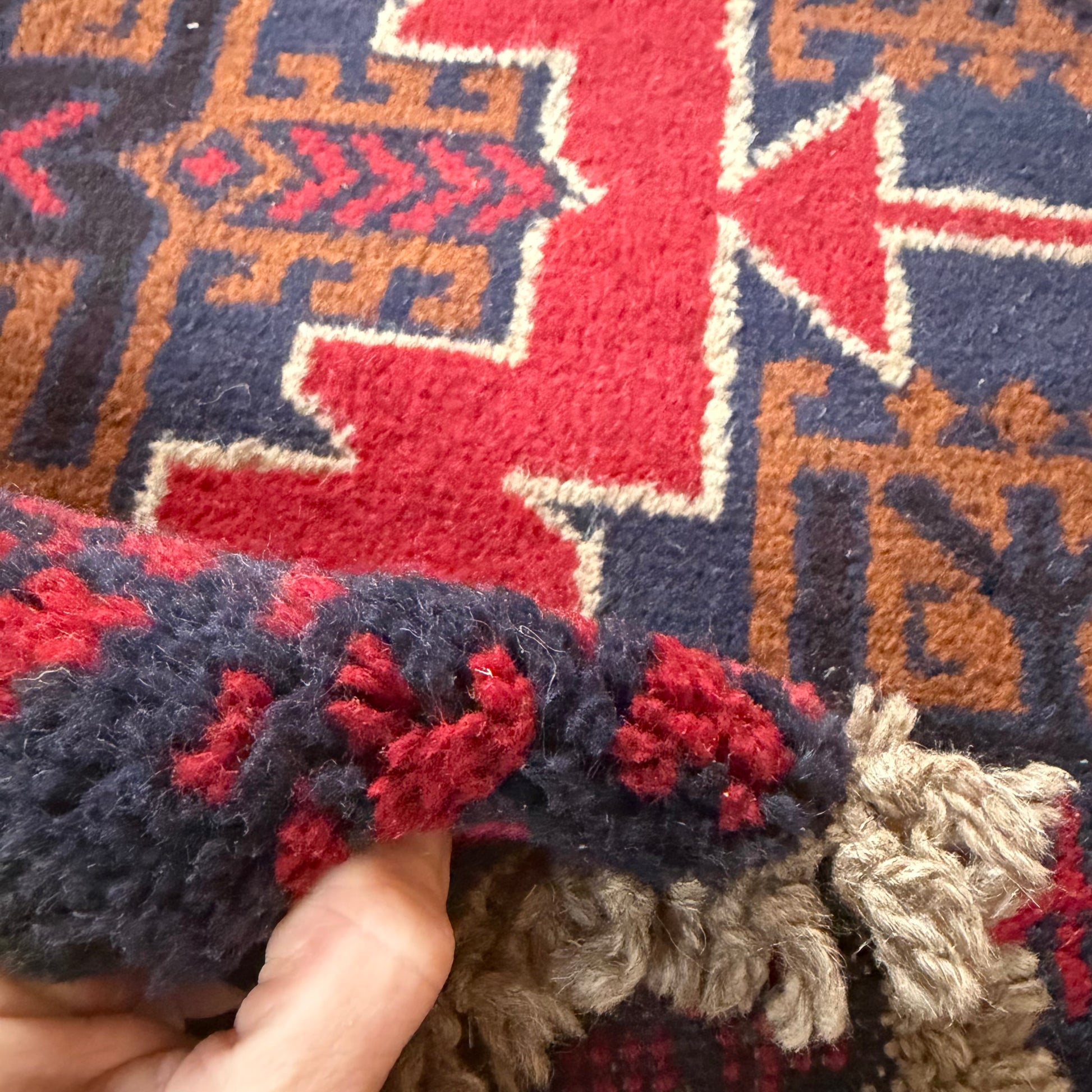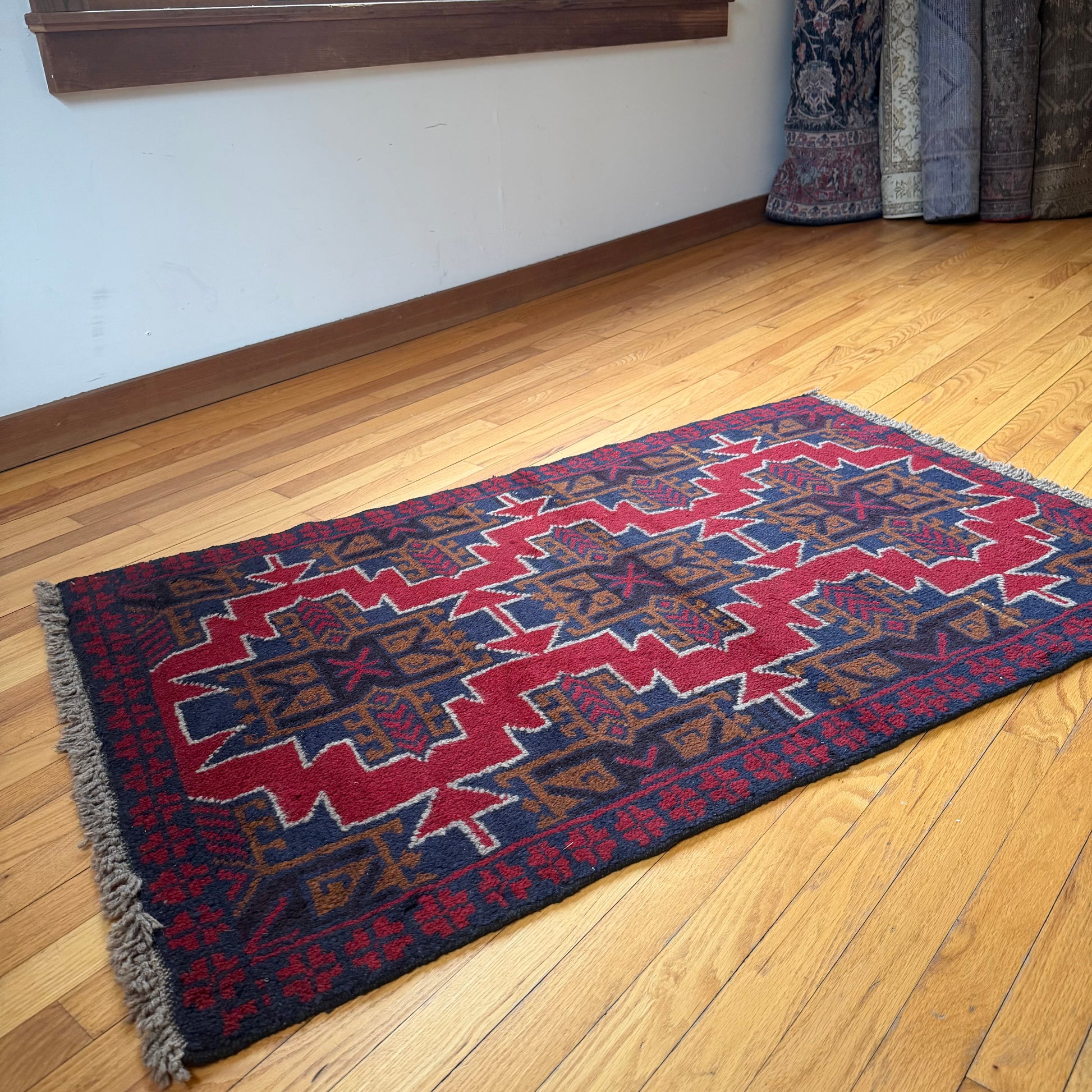 Camel brown with classic red and blue on this pretty little Baluch rug. Nice medium pile, light weight, handwoven wool.